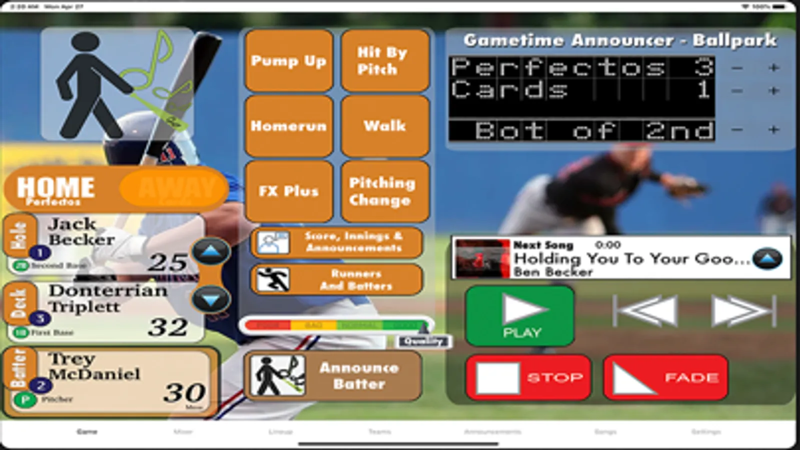 This free version of the app announces up to 4 players per home and away team lineups (see Ballpark version for as many as 40 players per side and Travel Team version to announce just one team's lineup).
