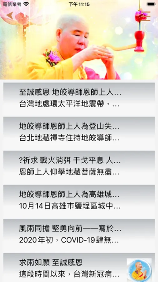 .雲端祈福聞妙法:地藏禪寺住持地皎導師恩師上人善巧方便度化眾生,讓忙碌的社會大眾用手機也能天天聽聞法師的開示,藉由一些因果故事,啟發智慧,反觀自性,懺悔業障,功德因緣殊勝難得。