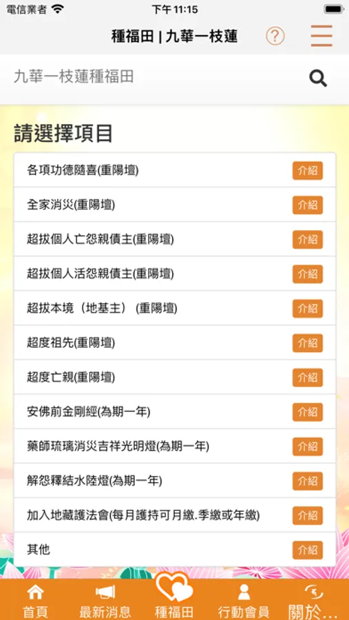 .三寶門中福好修:「福德因緣」就像一筆有備無患的存款,在人生旅途中,它是我們乘長風破萬里浪的善巧資糧;這些資糧須仰仗我們在三寶門中努力修福修慧,點點滴滴累積而成。而祖先及亡者更需要陽上眷屬為祂們廣植福田,仰仗三寶加持力得生善處。【九華一枝蓮】提供您不論您身在何方、仍可隨喜發心為自己或家人、親友、乃至祖先及亡親種福田的機會,只要您起一念歡喜恭敬心在線上報名您所發心的功德項目,填寫好資料,我們將儘快辦理您的發心項目。