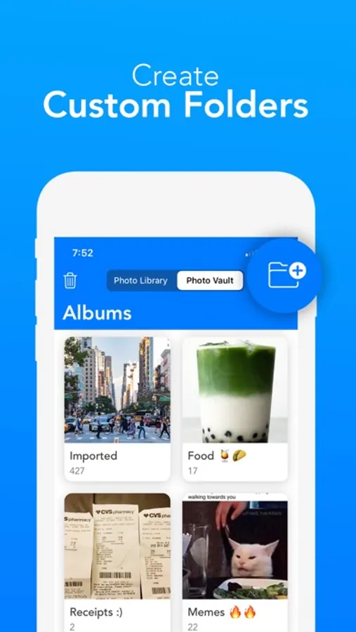 - Password Protected and Face Recognition Photo Vault with customizable folders.