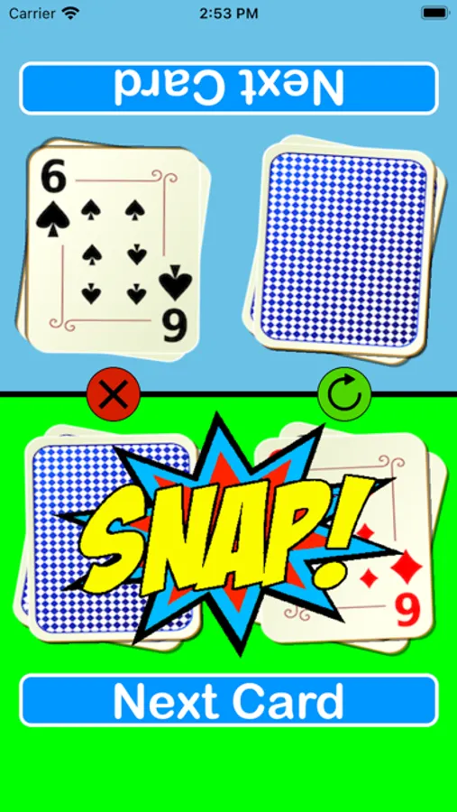 A simple and fun version the snap card game, suitable for people of all ages.Just tap your cards when you spot a matching pair. Play against each other or on your own with the single player mode that automatically changes difficulty to match the player.