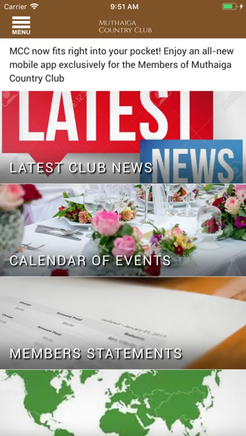 Delivering the ability to connect the Muthaiga Country Club to your mobile device. The Muthaiga Country Club app provides members with the ability to view their Statements, make Dining Reservations and even book Tee Times. Use the Roster to connect with other members and receive notifications on upcoming club events, all by the way of your handheld device or tablet.