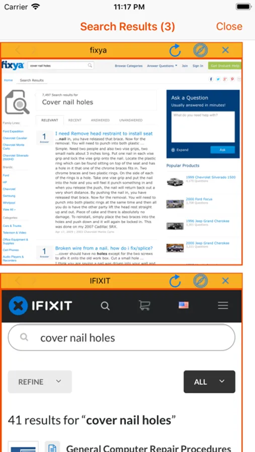 Cut search time down by searching directly a related set of URLs using the same search criteria. Each URL’s search result is displayed in a separate mini-browser. Scroll the set of mini-browsers; scroll within a mini-browser. Display a result full screen or in Safari.