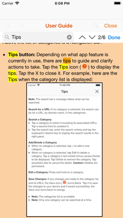 * Quick Guide and User Guide documents on how to use the app and its features. User guide includes a section of Frequently Asked Questions (FAQs) and can be searched for keywords and phrases.