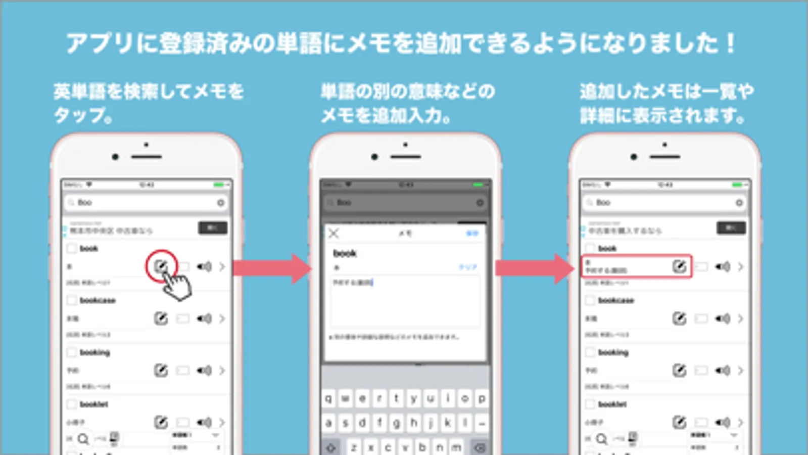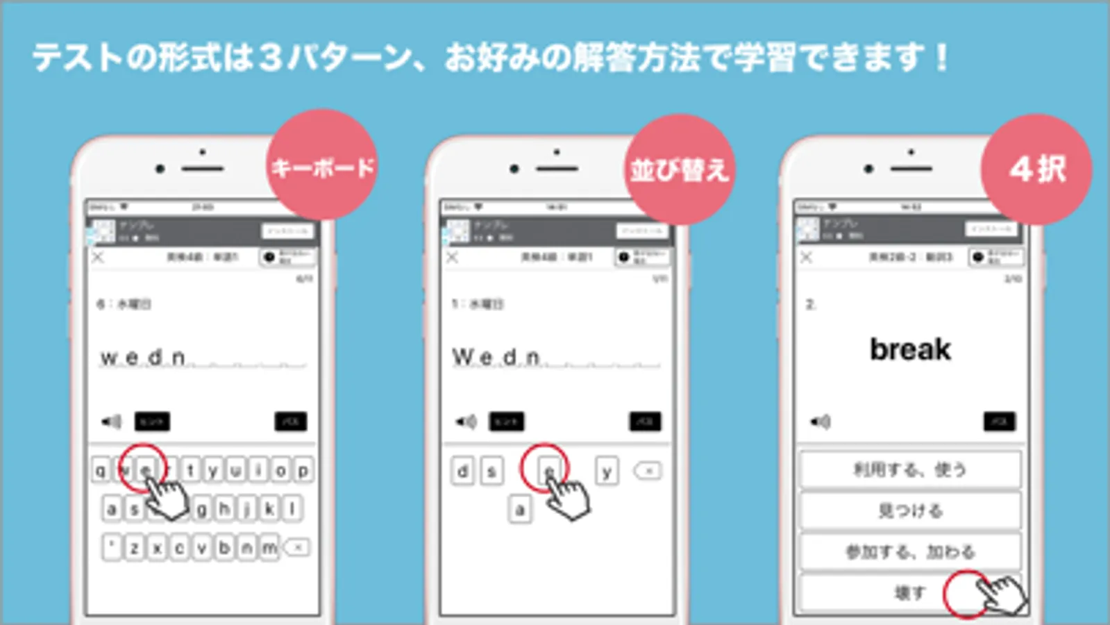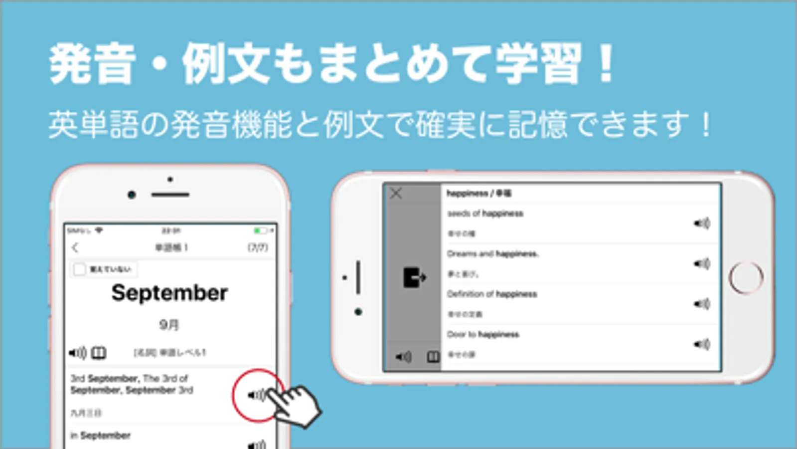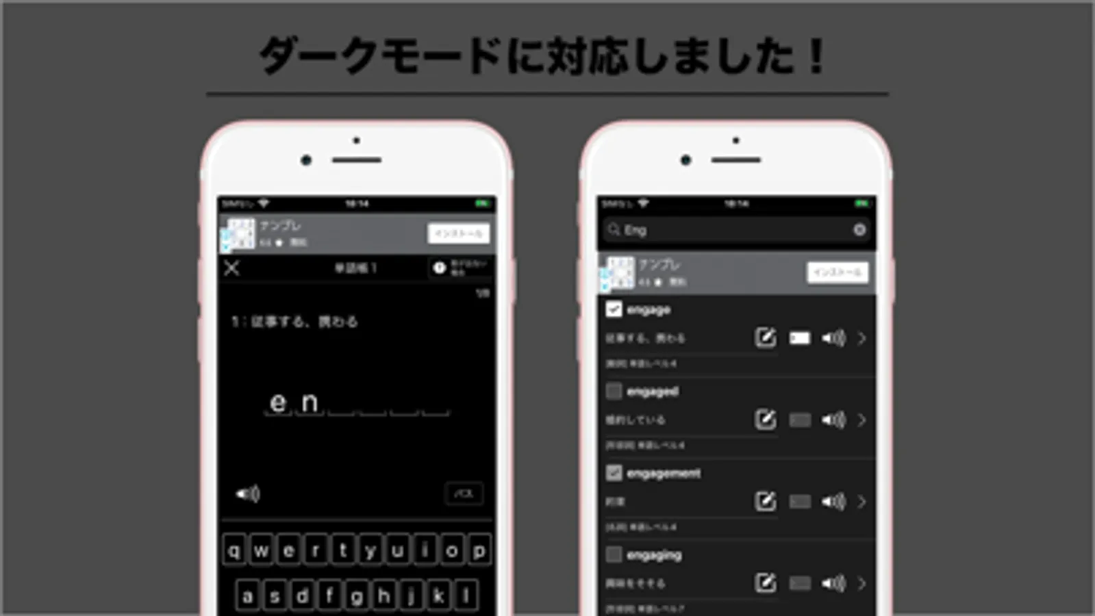 英単語のつづりと意味を覚える単語帳機能と、以下の強力な機能で英語学習をサポートします。