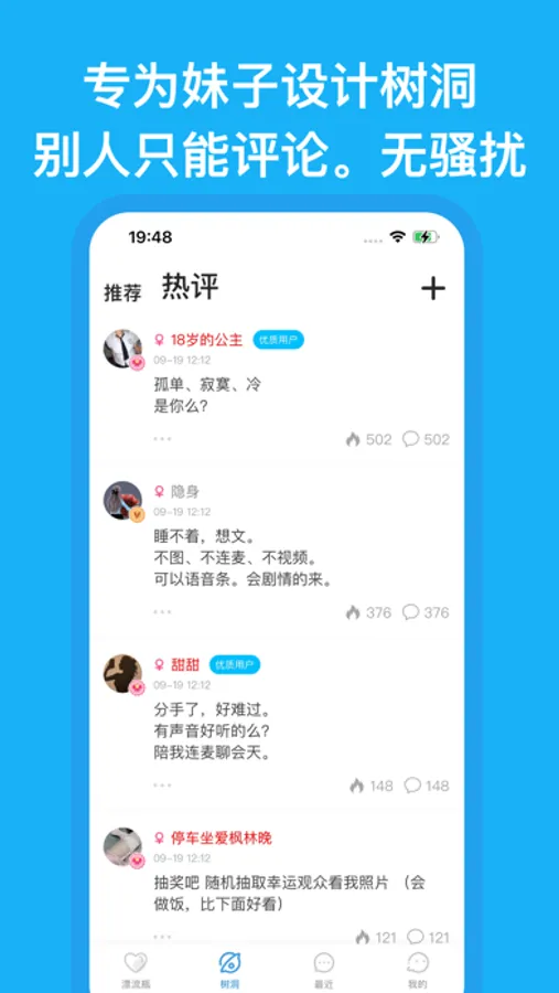 专为妹子设计的树洞:你可以在这里随便说什么心事,不用担心被打扰,因为他们只能评论你的树洞无法发起聊天,而你可以选择有趣的人进行回复。