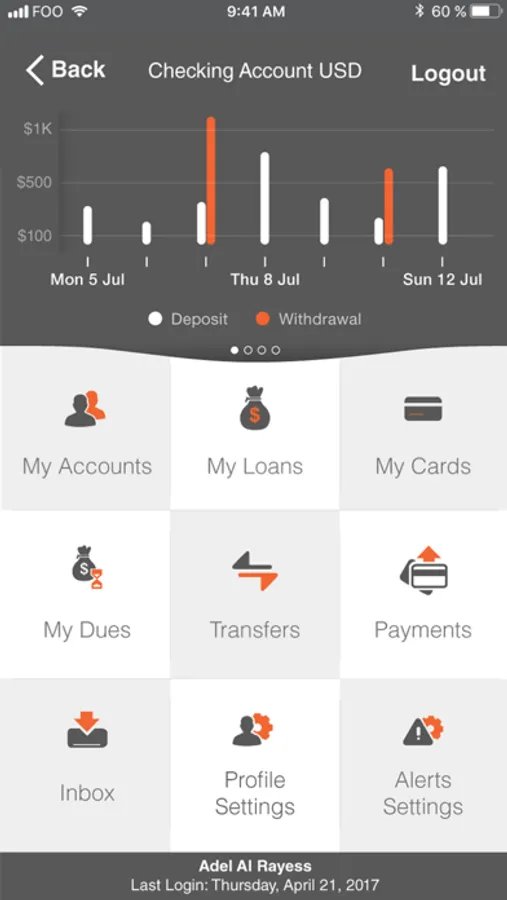 In the My card section, the client will have access to check all his credit and debit cards details: Transaction history, loyalty points, card limit, minimum dues, available balance.