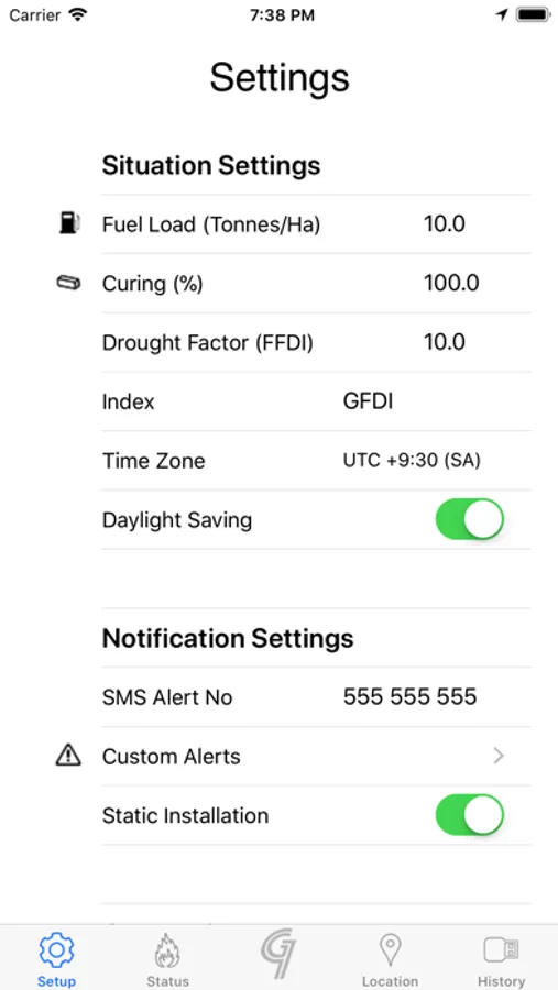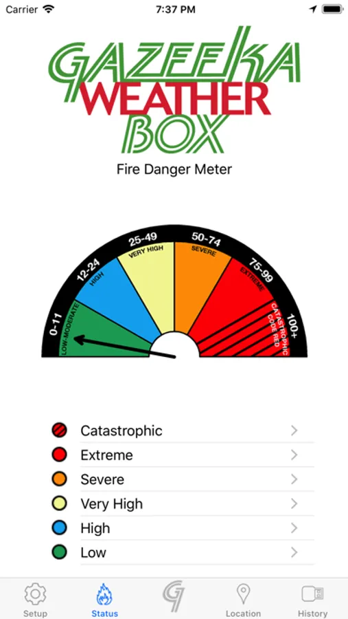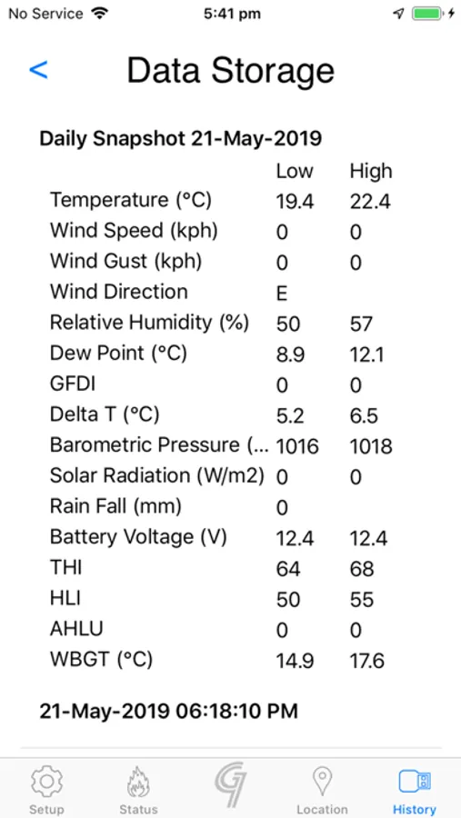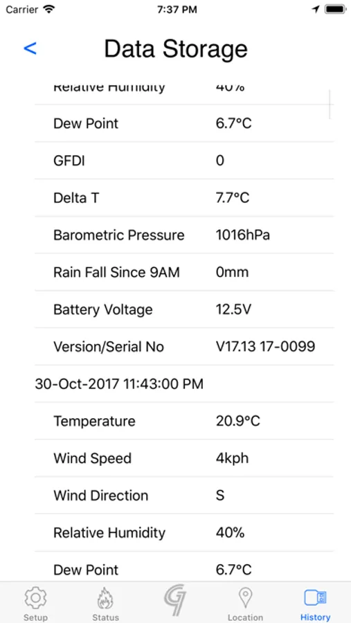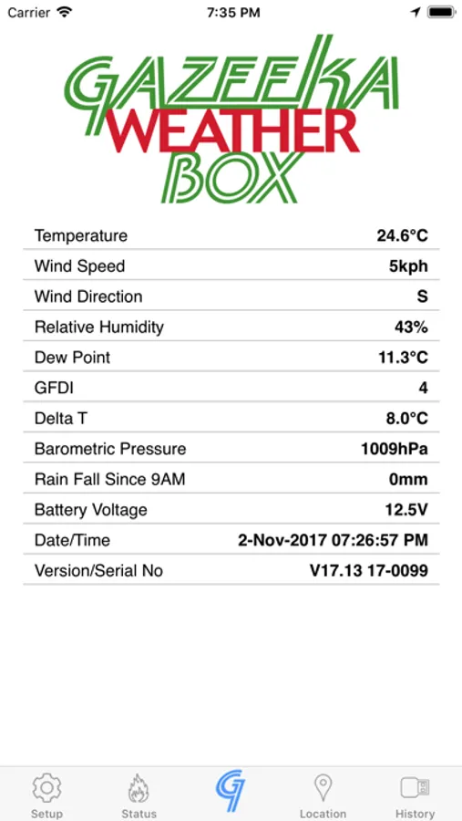 The WeatherBox has sensors for temperature, humidity, wind speed, wind direction, barometric pressure, gps location, slope, rain fall. The Fire Danger Index (FDI), dew point and Delta T are calculated from these measurements. Notifications and SMS Alerts are available for changes in some of these values.