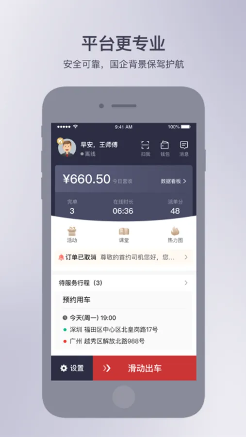 1.服务专业:合规可靠,国企背景保驾护航,让车主在工作中拥有足够的安全感,放心接单。
