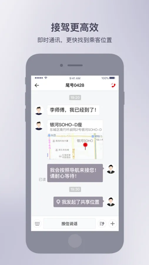 3.接驾高效:即时通讯,准确播报用户的实时位置,以便更快速准确的接到用户,给用户说曹操曹操就到的专车级体验。