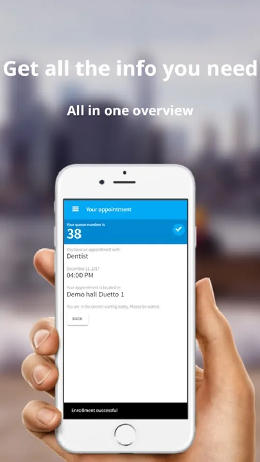 After registering to an appointment in ITTE Mobile, you will get access to the date and time of your appointment, the name of the clinician and the location of the appointment. You will get your queue number right away so that you know exactly when your appointment has started.