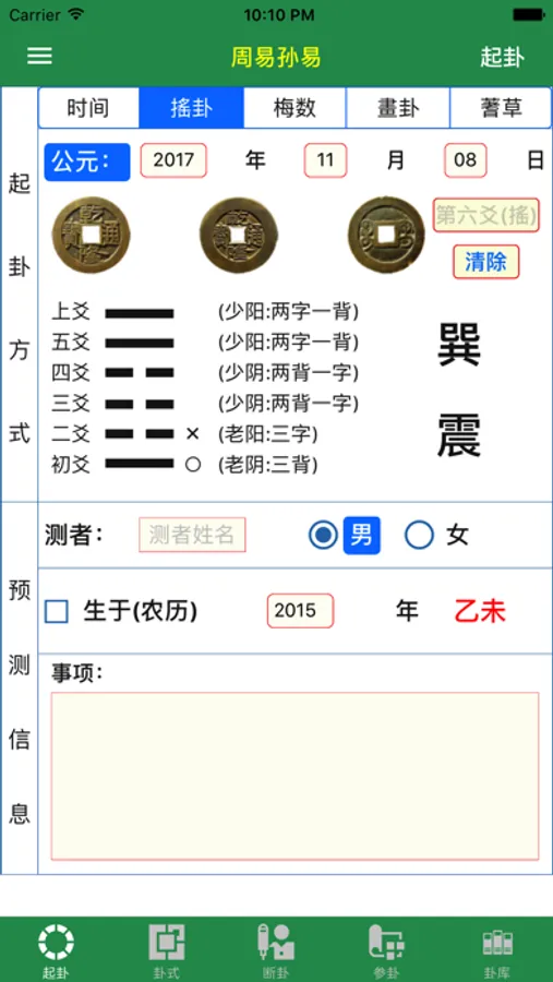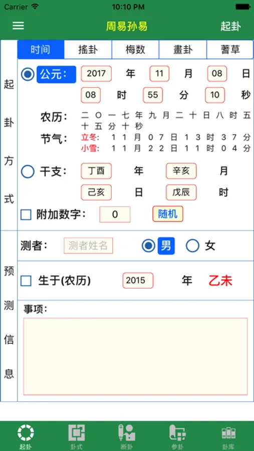 1.农历(公历)。根据农历(公历)时间起卦,可以附加随机数。