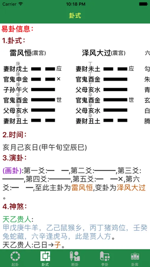 本软件卦式各爻排列含有天干、地支、六亲、世、应、动爻符号、世身、卦身、飞伏等文字。所排六爻卦式依据《卜筮正宗》和《增刪卜易》。