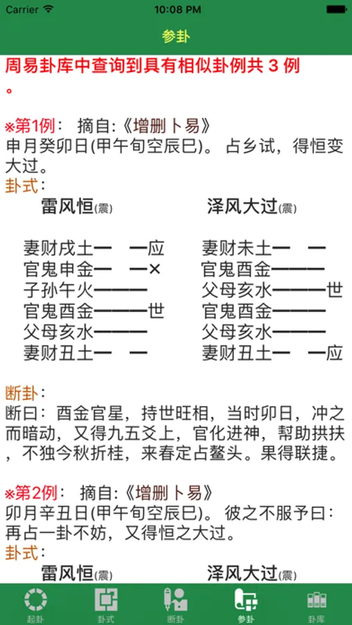 本软件提供周易六爻卦例 914 例,涵盖《增删卜易》、《周易与预测学》等书籍,方便你在断卦时参考。