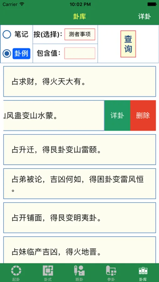 本软件可以保存断卦笔记,随时可以查询已经保存的断卦笔记和古籍卦例。