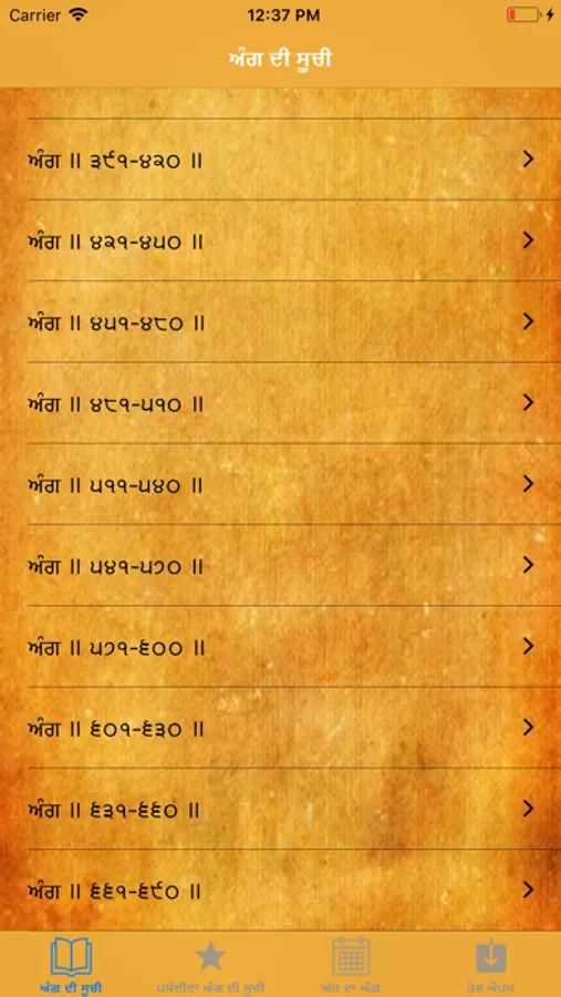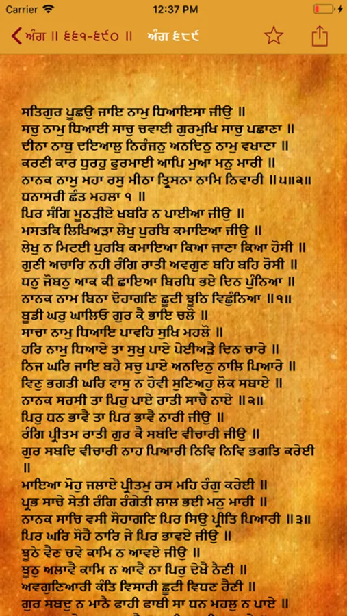 The text consists of 1430 angs (pages) and 6,000 śabads (line compositions), which are poetically rendered and set to a rhythmic ancient north Indian classical form of music. The bulk of the scripture is divided into thirty-one rāgas, with each Granth rāga subdivided according to length and author. The hymns in the scripture are arranged primarily by the rāgas in which they are read. The Guru Granth Sahib is written in the Gurmukhī script, in various languages, including Lahnda (Western Punjabi), Braj Bhasha, Khariboli, Sanskrit, Sindhi, and Persian. Copies in these languages often have the generic title of Sant Bhasha.
