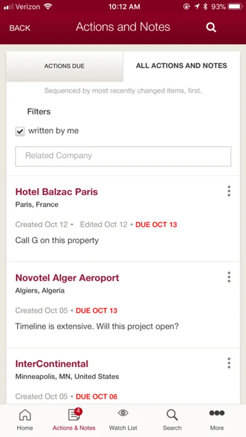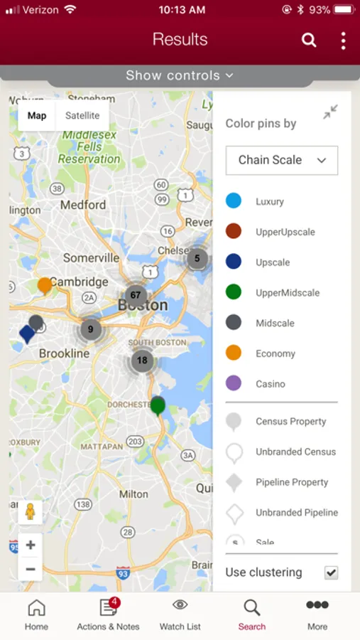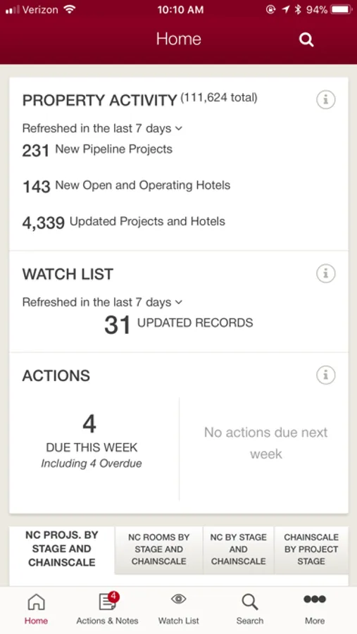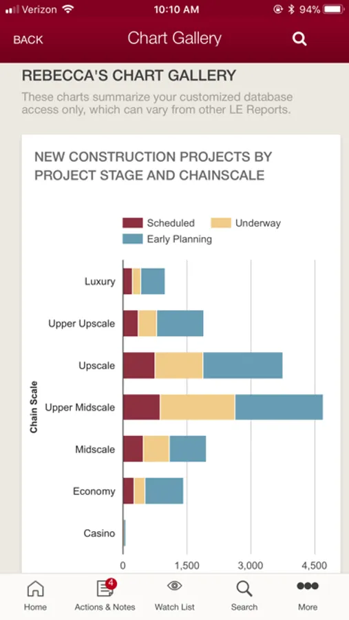 Quickly and easily visualize a found set of properties or companies on an interactive map. Properties can be viewed by chain scale, record type, project stage, room count and franchise company. Clicking on any property pin will result in a property detail pop-up window where you can click for more details, add the property to your Watch List or create a Note.