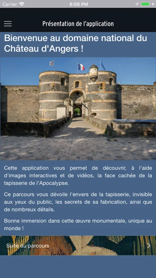 Cette application, permet de découvrir, à l’aide d’images interactives et de vidéos, la face cachée de la tapisserie de l'Apocalypse. Ce parcours dévoile l'envers de la tapisserie, invisible aux yeux du public, les secrets de sa fabrication, ainsi que de nombreux détails.