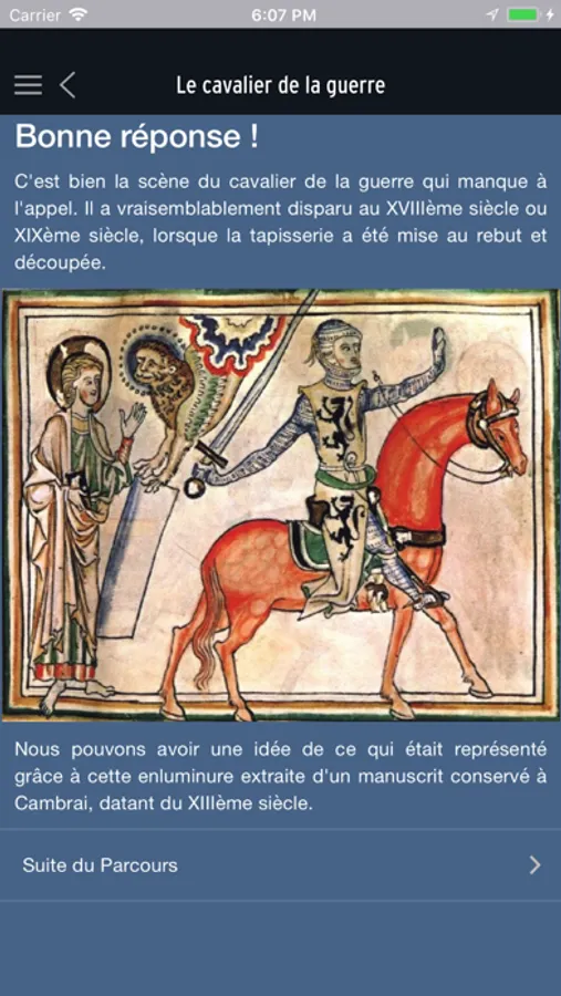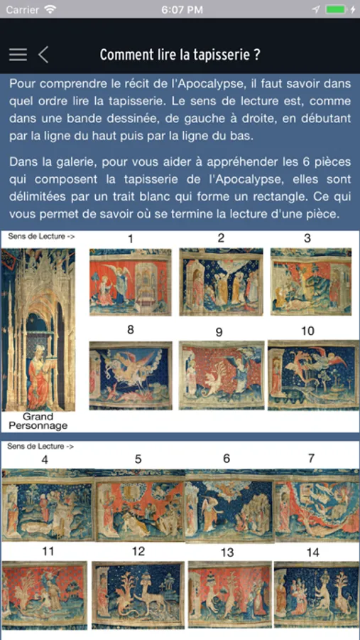 Après une introduction sur l’histoire de la tenture (frise chronologique), l’évocation de son sujet et de sa commande, l’application propose une vidéo pour comprendre les techniques de fabrication d’une tapisserie.