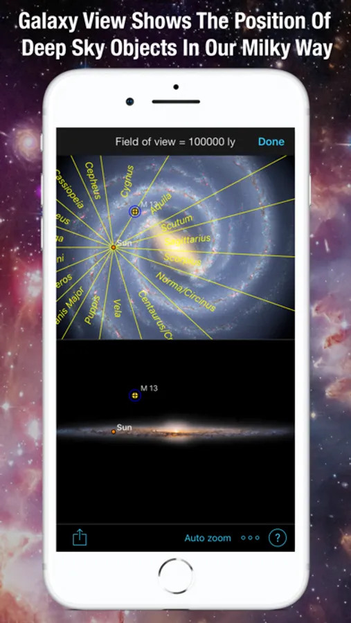 • Galaxy View shows the position of deep sky objects in our Milky Way!