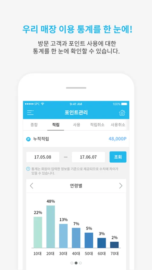 방문 고객과 포인트 사용에 대한 통계를 한 눈에 확인할 수 있습니다.
