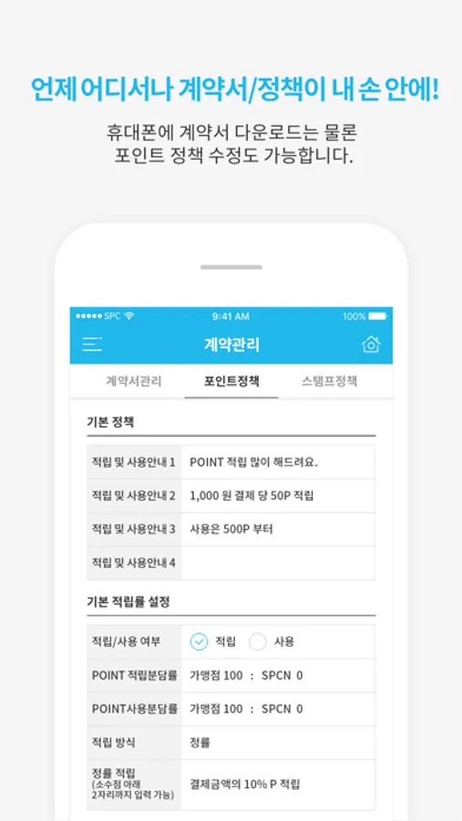 휴대폰에 계약서 다운로드는 물론 포인트 정책 수정도 가능합니다.