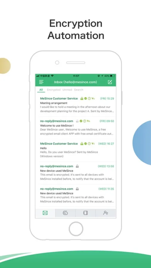 MeSign App is an encrypted email client that is free and easy-to-use. No need to register a new email account. Just download MeSign app and log in to your existing email account. In a few moments, your free email certificate will be automatically installed, and you can start sending encrypted and digitally signed emails as easily as regular cleartext emails. Your emails will be stored in ciphertext on your email server only. Your email privacy will be end-to-end encryption protected.