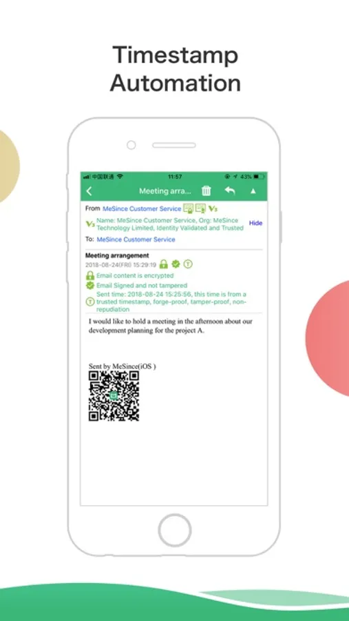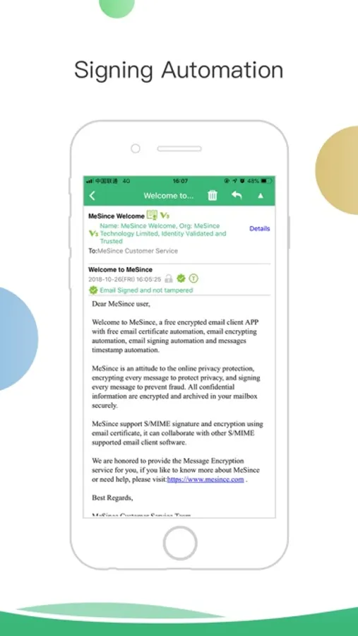 Real privacy of communication requires encryption of emails in transit and at rest. It is normally a hustle to apply, install and configure email certificates into your email client. We have achieved a completely automated S/MIME encryption without changing your email address. MeSign app automatically installs and configures S/MIME certificates issued by MeSign CA in a few minutes after logging in. Then, all your outgoing emails will be encrypted to ensure protection and confidentiality.