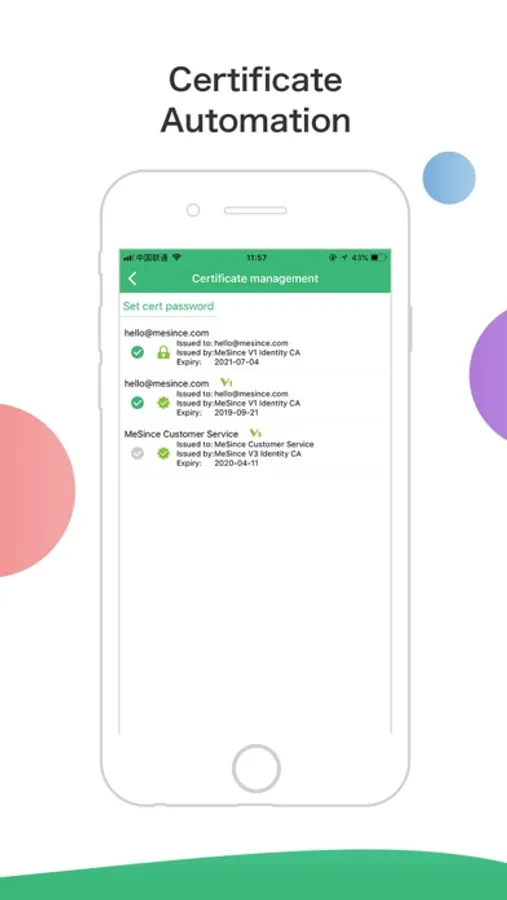 The free cloud key management service enables you to automatically install your encrypting certificate whenever you install MeSign App from a new device to log in to your email. The expired email certificate will also be automatically renewed for free.