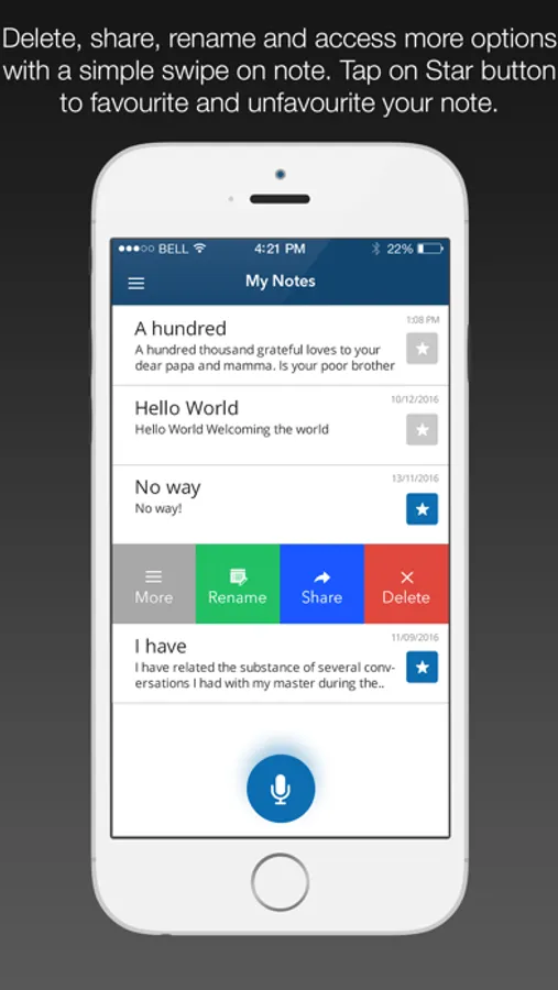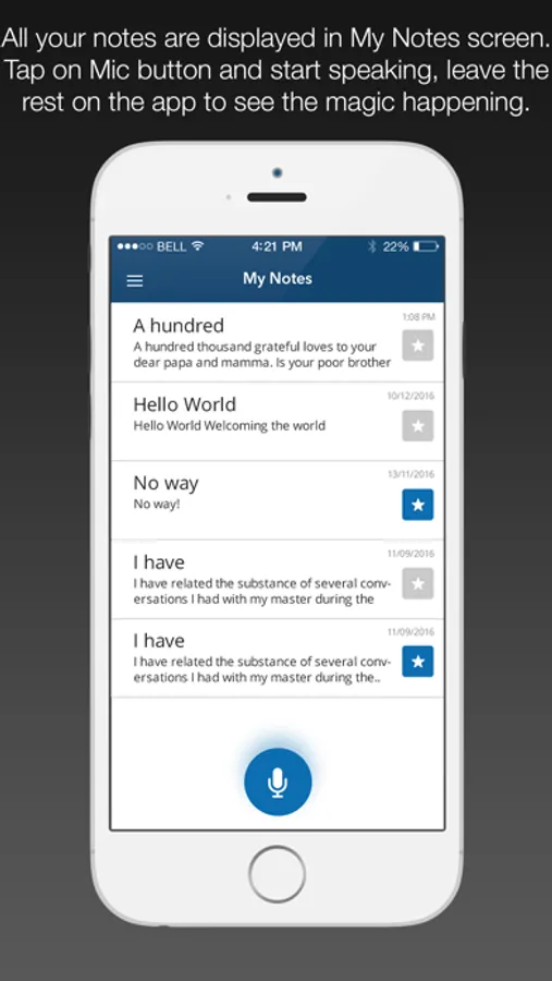 - All your notes are displayed in My Notes, you can tap on the mic button and start speaking. Leave the rest on the app to see the magic happening.