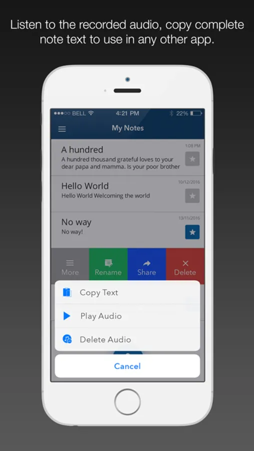 - Delete Note, Share Note, Copy Note, Play Audio & Delete Audio features can be accessed with a simple swipe on the note.