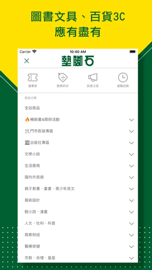 您所熟悉的墊腳石現在也有APP為您提供線上服務,歡迎光臨「墊腳石樂購家」!