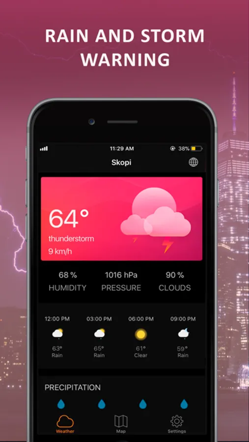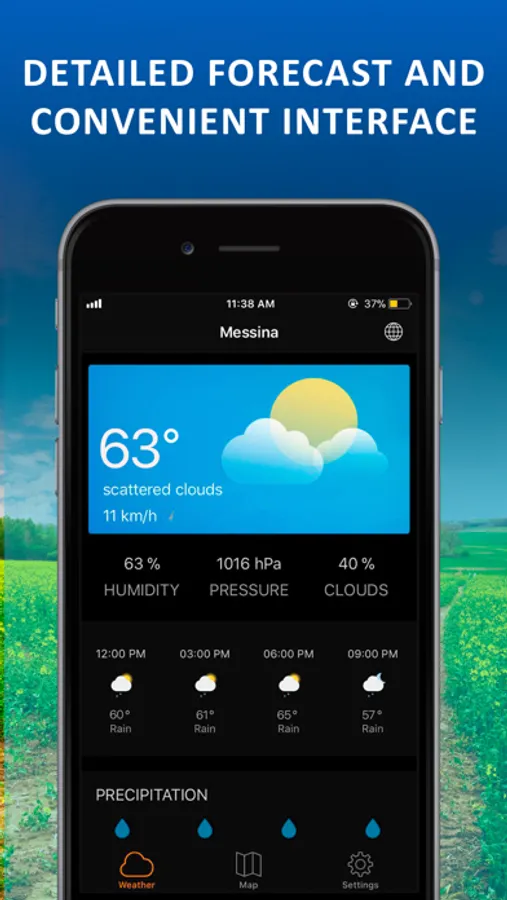 Due to overlaying interactive maps you can follow the weather changes and receive regular weather warning about storm, dark skies or heavy shower.