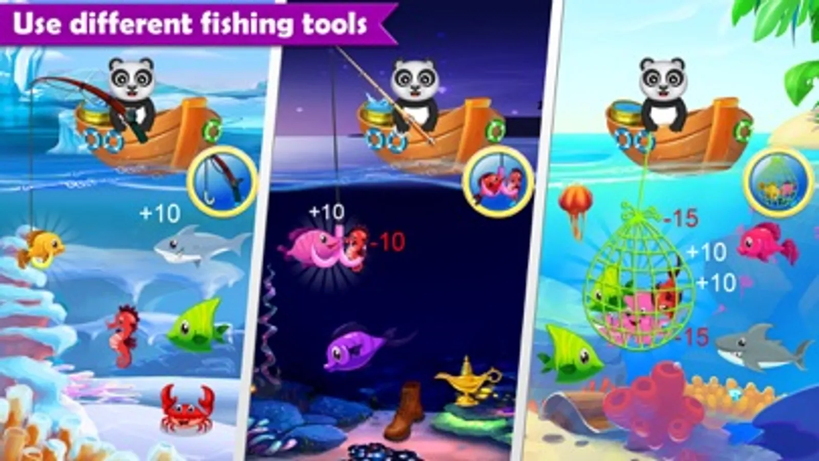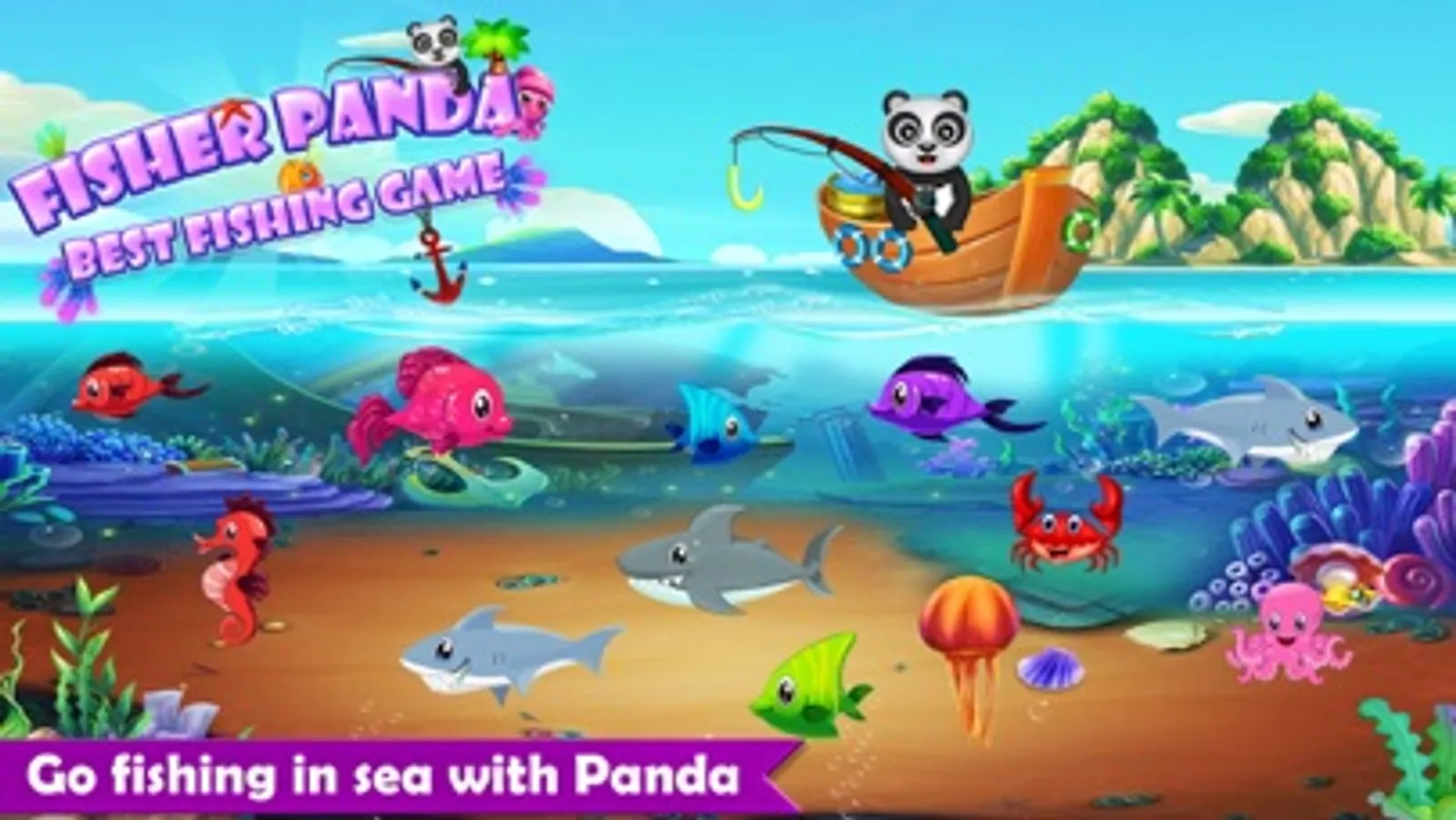 Do you love fishing? Like to explore the sea and sea creatures? There are lot of beautiful fish and other sea creatures waiting for you. Let’s go catch some fish with our Fisher Panda.