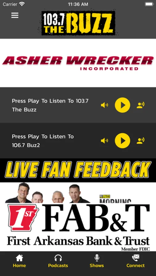 103.7 The Buzz and 106.7 Buz2 are the home of fun and games in Arkansas and online around the world. All day local sports talk with dynamic hosts, exciting guests and compelling content. Stick around outside of our local programming from 6am-7pm for additional shows that are produced locally and cover everything from horse racing to sports wagering as well as golf and hunting and fishing. The Buzz also offers great national programming from our network partner ESPN. 103.7 The Buzz and 106.7 Buz2 are also the home of Arkansas Razorback Football, Men’s Basketball and Baseball. Also appearing on our stations are: Dallas Cowboys Football, Kansas City Chiefs Football, Memphis Grizzlies Basketball, Little Rock Trojans Basketball, High School Football, the NCAA Men’s Basketball Tournament, the CFB National Championship, the Super Bowl and much more. The Buzz is your home for sports and fun in central Arkansas!