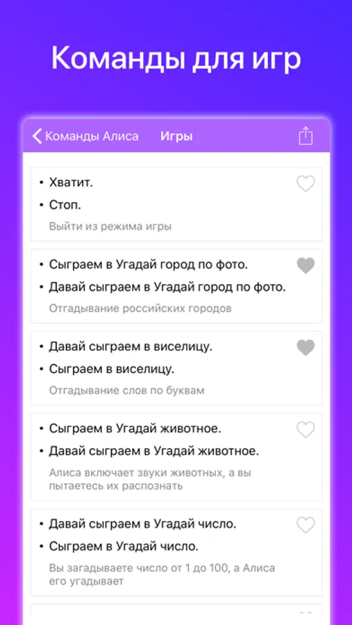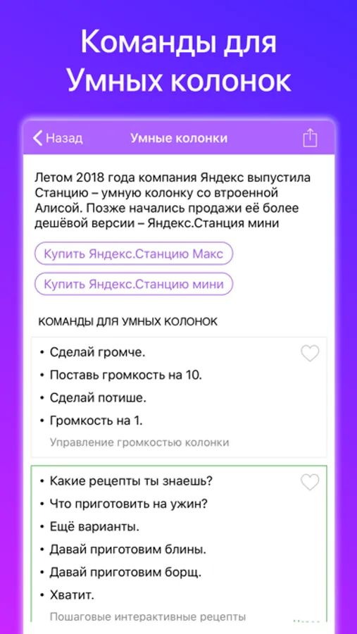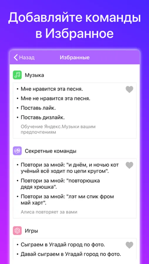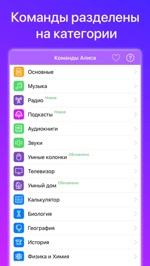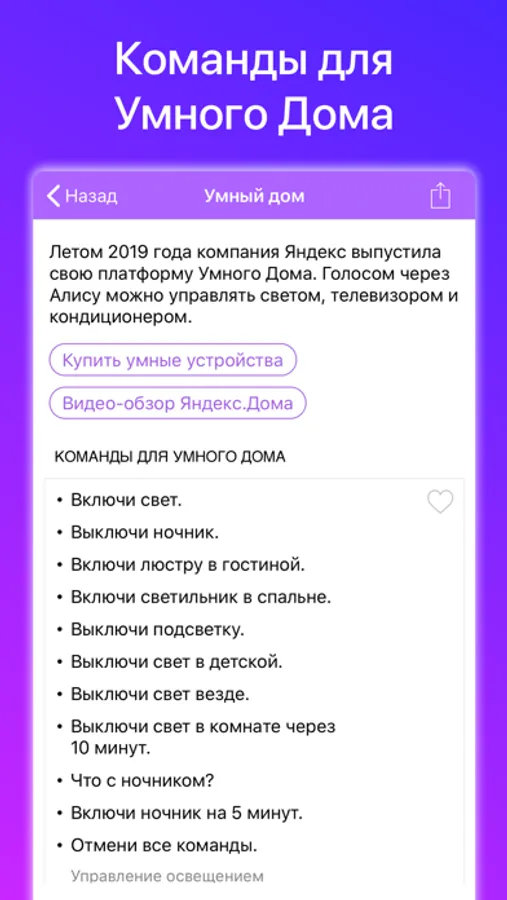 This app provides a full list of commands for Yandex Alisa. All commands are categorised. This app DOESN'T HAVE an embedded voice assistant, you should install the app called "Yandex" for doing voice commands.