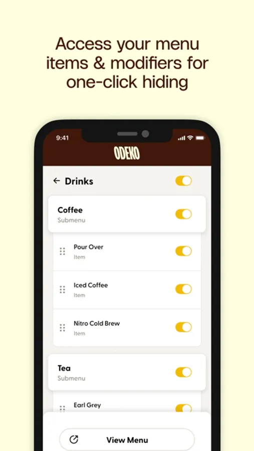 Easily hide and unhide menus, menu items and modifiers from directly inside the app, allowing you and your team to keep your menu fresh for your customers ordering ahead!