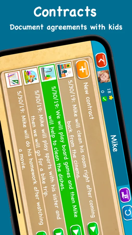 ● Sometimes kids forget or remember differently what they agreed with you. Now you can document contracts that you agree with your kids. Record your voices for a future proof of the agreements. After some time you can check which agreements were fulfilled successfully and which not.