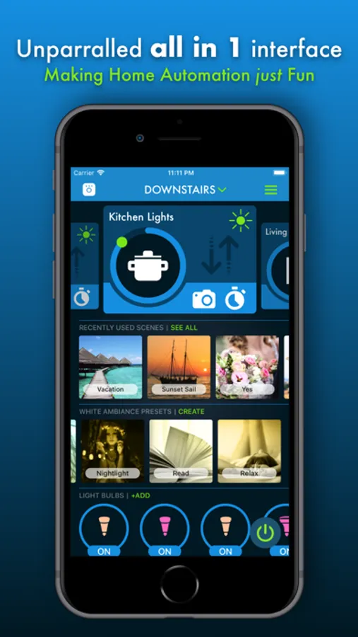 It all starts with the Room or Group in mind. From your Room, you can control, pick a color, select scenes, quickly set white ambiance scenes, create your own, change lights or quickly set any of the routines. Use the brightness dial to adjust the atmosphere of the Room. Rooms are connected to a master grouping like “Downstairs”. Drop down the menu at the top and make your selection. Rooms are automatically filtered
