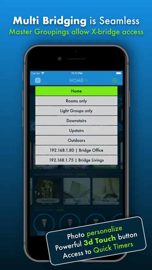 The We Hue app seamlessly integrates multiple Philips Hue bridges. You wouldn’t even know when using the app you had more than one. Remove or add a new bridge at any time