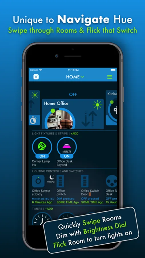 You ain’t seen nothing yet. It’s all about making your experience seamless navigating your Philips Hue lights. We don’t like going back and forth in many list views. That’s why in our app we have created an all in one view where we bring all key elements together. You can easily swipe your Rooms from left to right. Flick a Room, quickly set a timer, schedule an alarm, change your Hue lights using scenes or white ambiance preset scenes and easily change the setup of a Room. We love, We Hue. Enjoy