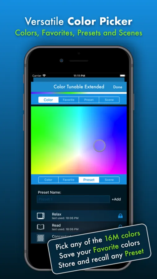 Tap within the circle of a Room or Light to open a versatile Color Picker. Within you can change the color of your Hue lights, change color temperatures, use color favorites, create presets and have access to a collection of beautiful scenes. Preset scenes are powerful and allow you to manage and keep your own created scenes for later