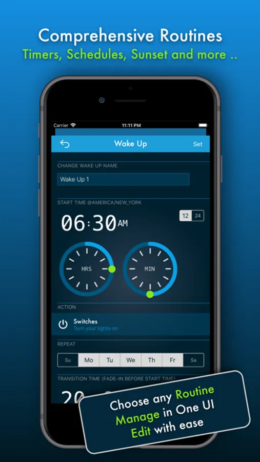 In need for comprehensive scheduling of your Hue Lights? Tap the Timer Icon to access a broad selection of Routines. Ranging from quick timers, you might want to turn off lights in your living space after a short while going to bed, to more advanced scheduling options like Wake Up allowing your bedroom to be lit with your Hue Lights gradually fading-in giving a good start to any day