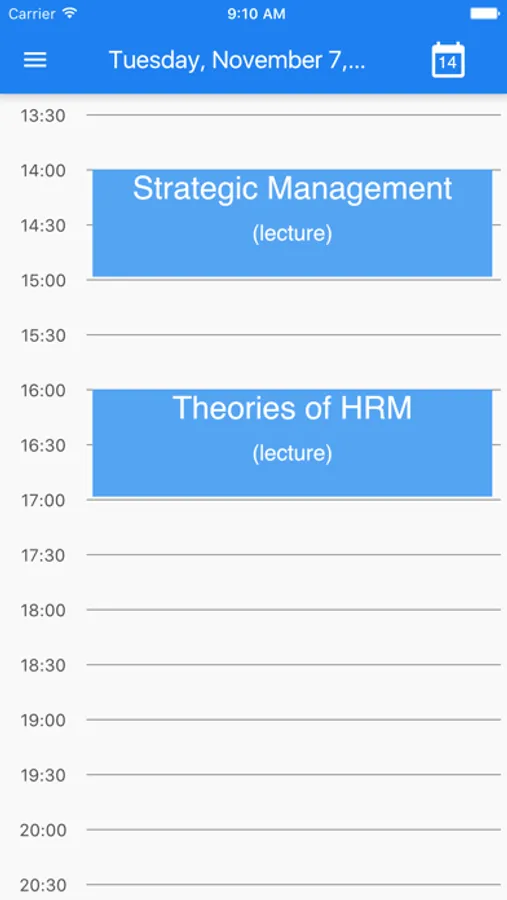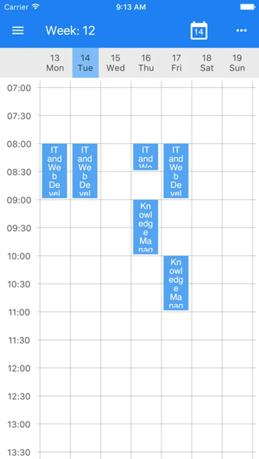 All the timetable events are shown in a blue color (blue boxes) next to corresponding hour. By tapping on these events you will get a detailed description. Non-lecture events like exam reservation or other custom events set by school administration are shown in light blue color.