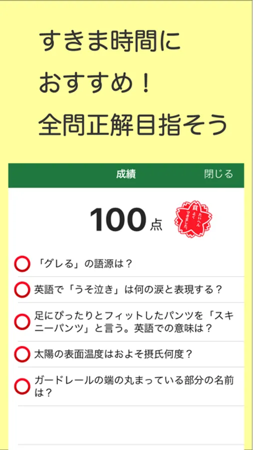 1問ごとにサクサク答え合わせをして、雑学を身につけよう!