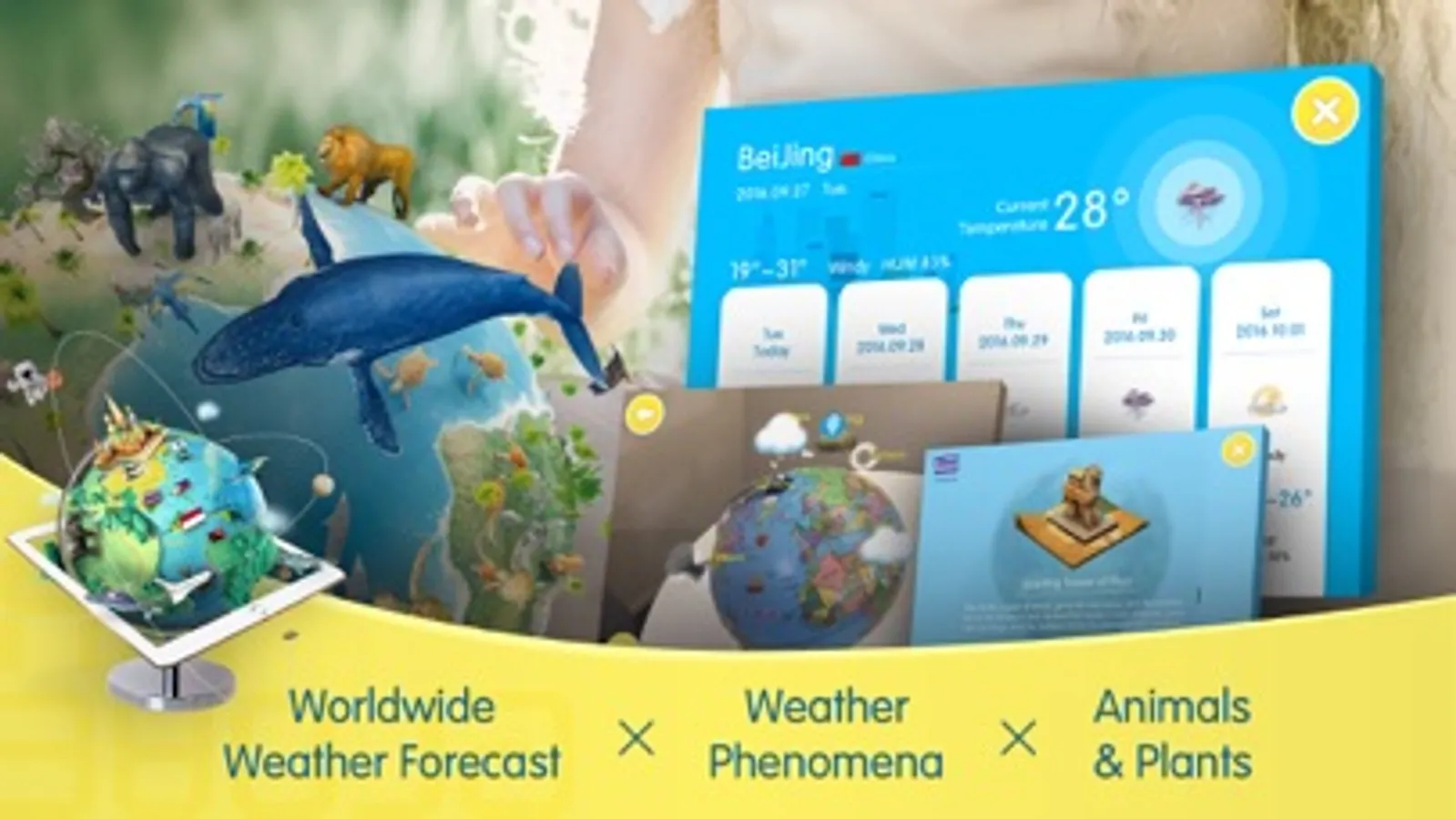 By engaging the modern technology of AR (augmented reality) with classical globe, we are able to bring children a brand new experience : realistic 3D objects with animations and sounds are presented according to geographical information, allowing children to learn comprehensive knowledge while play.