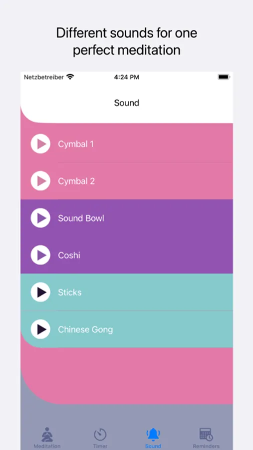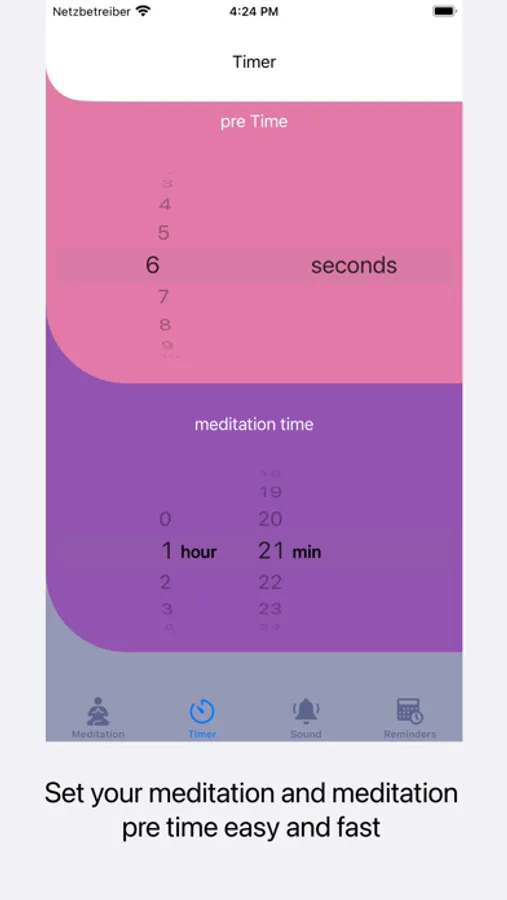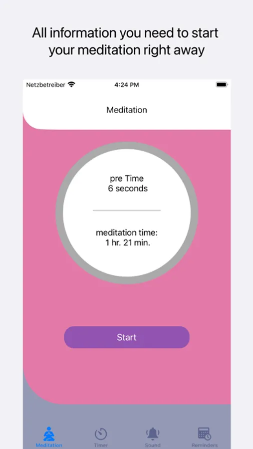 With MindSpace you are able to set your custom time for your meditation. To have enough time to prepare yourself for your meditation you are able to set a pre-time counting from 1 to 60 seconds. You can choose between 6 different sounds that play as soon as you have completed your meditation.