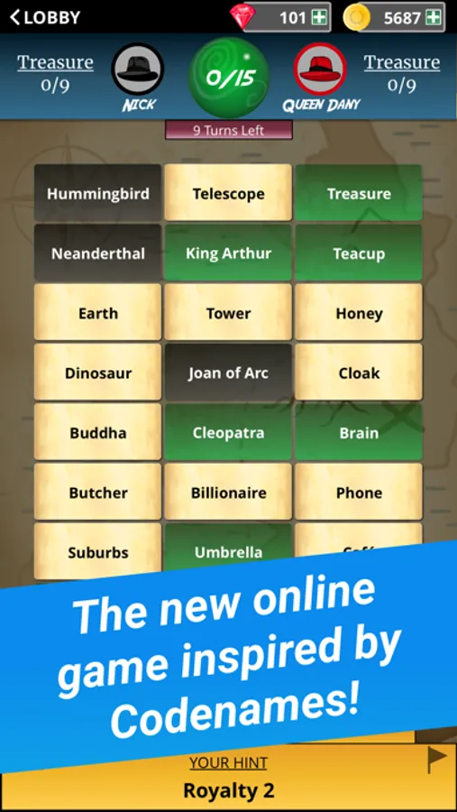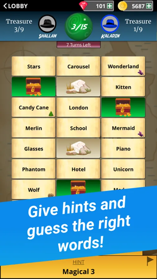 Inspired by the popular party game Codenames, Words to Treasure is a fun, cooperative word association game. Play with friends or get matched with players from around the world! Work together to give hints and make guesses to uncover all the right words on the board. Glory and fortune await you…just watch out for traps.