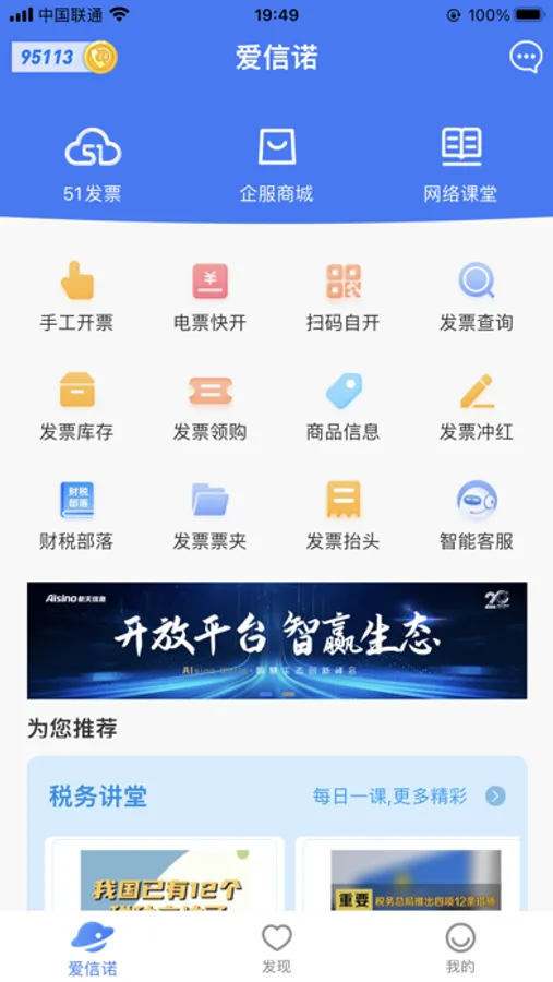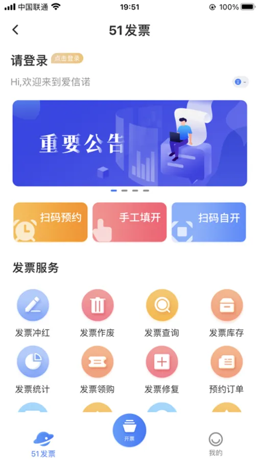 基于航天信息51云开票平台的移动开票软件,支持增值税普通电子发票和卷票的开具、冲红和作废功能,支持账户管理和商品管理的云储存,支持发票条件查询和月度统计查询。满足当代社会移动便捷的生活习惯,方便了纳税人的开票流程。