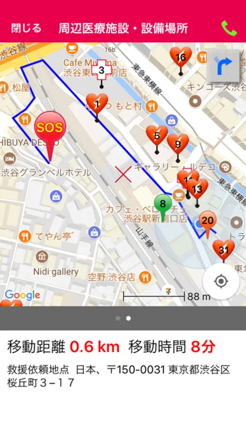 MySOSをインストールしている人に救援依頼(SOS)を送信することが出来ます。救援依頼を受信すると発報場所と自分の場所を地図上に表示し、ルート案内もできます。救援依頼時に受諾者と匿名かつ無料で通話ができます。